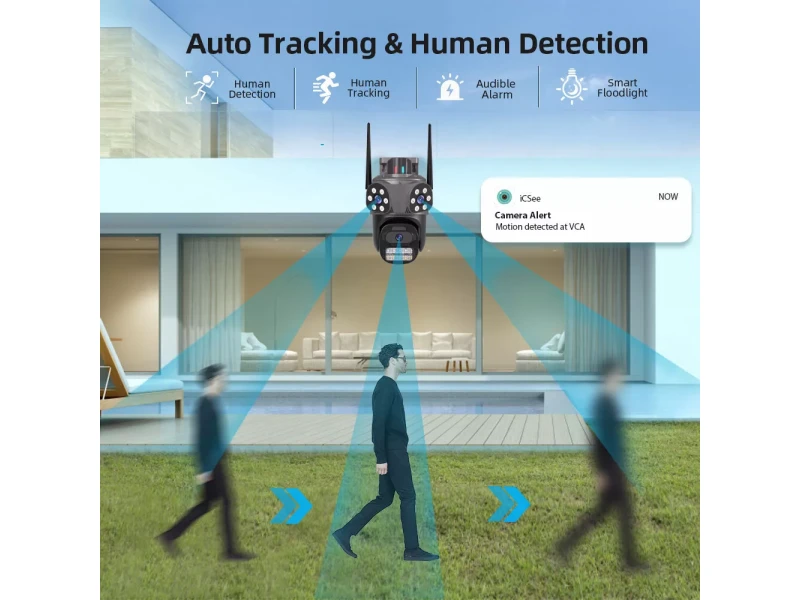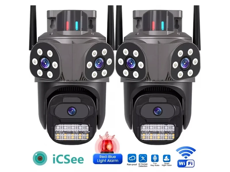 • 2бр. Тройна външна въртяща WiFi AI камера 10MP с три обектива, ICSee, Черна