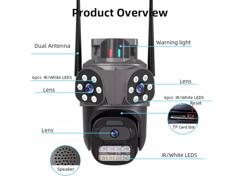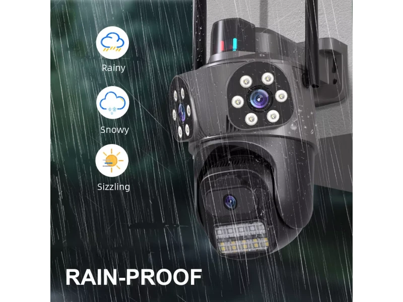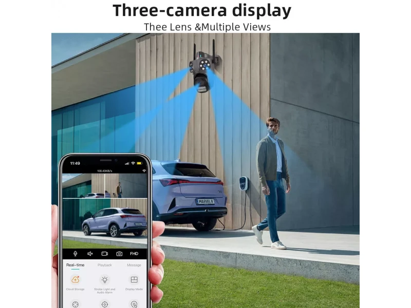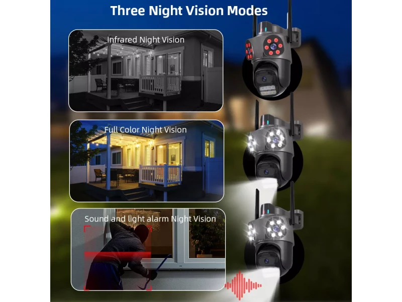 Тази високотехнологична WiFi камера осигурява професионално видеонаблюдение с три обектива и троен екран, което позволява едновременно следене на различни ъгли. Благодарение на 10MP резолюция и 5X оптично увеличение, получавате ясна и детайлна картина дори от голямо разстояние.