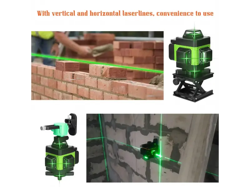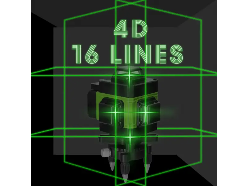 4D ЛАЗЕРЕН НИВЕЛИР с 16 линии (четири точков) самонивилиращ се, със зелен лазер. Възможност за включване и изключване на линиите по отделно, от нивелира или чрез дистанционно.