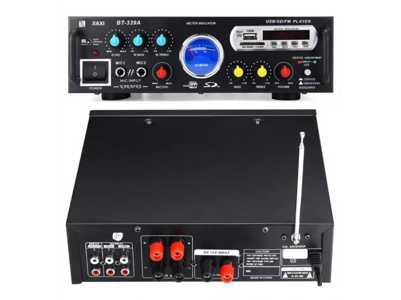 Описание:Аудио усилвателят е многофункционален стерео усилвател, който предлага високо качество на звука, безжично свързване чрез Bluetooth и множество възможности за свързване с различни аудио устройства. Той е предназначен както за домашно озвучаване, така и за професионална употреба в малки помещения или офиси. Компактен и лесен за употреба, този усилвател осигурява мощен звук и лесно управление на свързаните устройства. Особености:Лесно свързване с всякакви Bluetooth устройства като смартфони, таблети и лаптопи за безжично възпроизвеждане на музика. Поддържа RCA входове за традиционни аудио източници (CD плейъри, DVD плейъри и други), USB порт за възпроизвеждане на музика от флаш памет и слот за SD карта. Комплектът включва дистанционно управление за лесно превключване между функциите и настройка на силата на звука от разстояние. Вградена възможност за настройка на басите, високите честоти и баланса на звука. Вградено FM радио за слушане на радио станции с възможност за автоматично сканиране на честоти. Дизайн:Продукта се отличава с модерен и компактен дизайн, подходящ за различни интериори. Панелът е изработен от метал с гладко черно покритие и има интуитивен дисплей, който показва информация за входния източник и текущата честота на FM радиото. Контролните бутони са разположени предимно на предния панел за лесен достъп, докато задната част съдържа всички аудио входове и изходи. Технически характеристики:Изходна мощност: 2 x 40W;Импеданс: 4-16 Ohms;Честотен обхват: 20Hz – 20kHz;Bluetooth обхват: До 10 метра;FM честоти: 87.5MHz - 108MHz;Входове: 2 RCA входа, USB порт, SD слот, FM антена;Захранване: AC 220V / 50Hz;Размери: 26 см x 21 см x 6 см.;Тегло: 1.8 кг. Какво ще намерите в опаковката:1 х Аудио усилвател BT-339A;1 х Дистанционно управление;1 х FM антена;1 х Захранващ кабел;Ръководство за употреба;Транспортна опаковка;Гаранция: 12 месеца.