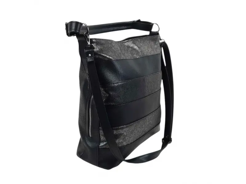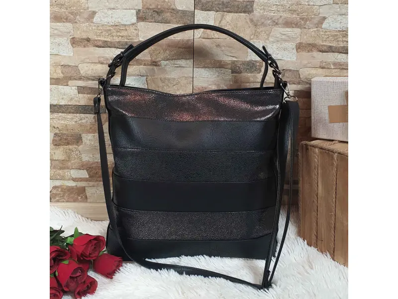 Българска дамска чанта от качествена еко кожа. Чанта тип торба с едно голямо отделение с цип, разделено на две от отделение с цип, малко вътрешно джобче с цип, отделение за телефон и документи, заден джоб с цип и два странични джоба с цип. Голяма чанта с удобна дръжка за носене и допълнителна дълга регулираща се дръжка.