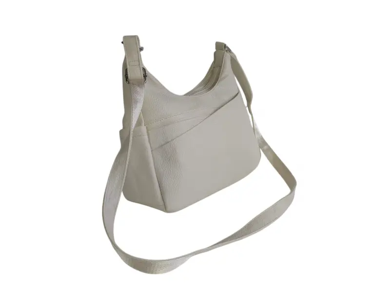 Средна дамска чанта от качествена еко кожа. Бежова дамска чанта с много отделения и регулираща се дълга дръжка. Ежедневна дамска чанта с интересен дизаин.