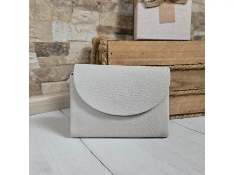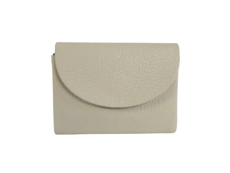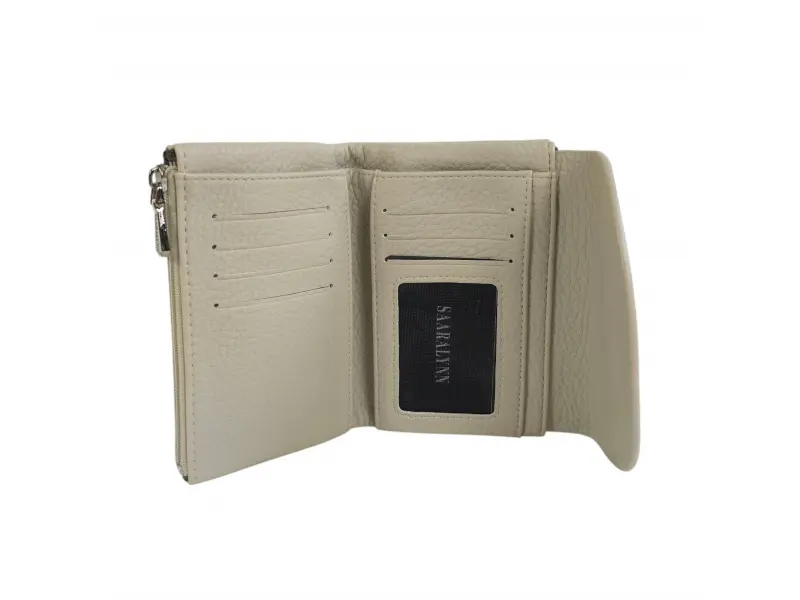 Атуално дамско портмоне с интересен дизайн от качествена изкуствена кожа. Практично дамско портмоне с удобни отделения за банкноти, карти и монети. Бежово дамско портмоне с магнитно закопчаване.