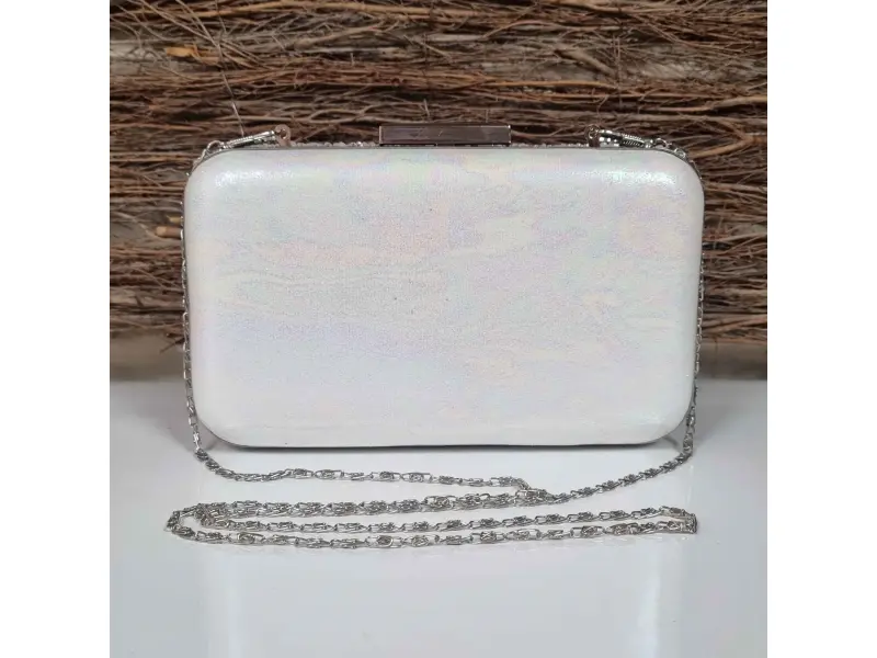 Бяла блестяща чанта с хамелеонов гръб с едно отделение със сребърен кант и дълга дръжка тип верижка. Дамска чанта подходяща за абитуриентски бал, сватба или специално събитие.