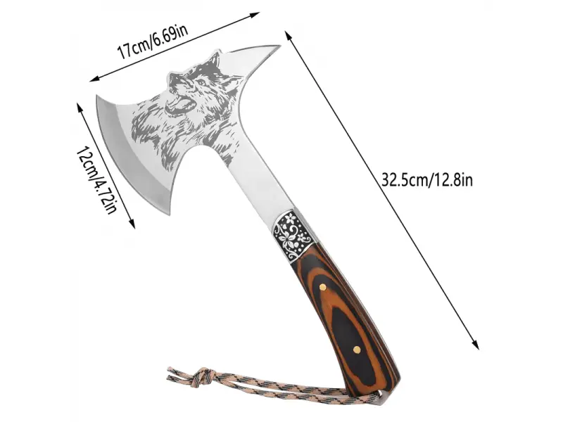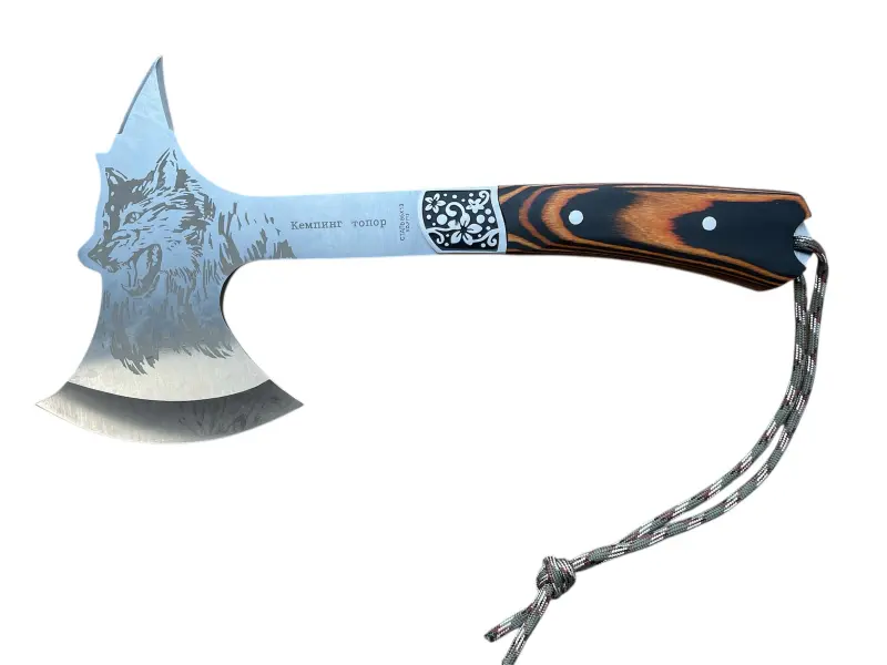 Тази брадва се отличава с уникално лазерно гравиране на вълк от двете страни, което ѝ придава индивидуалност и стил. Извитият ръб я прави универсална за различни приложения – от цепене на дърва до разкъсване на материали по време на оцеляване.