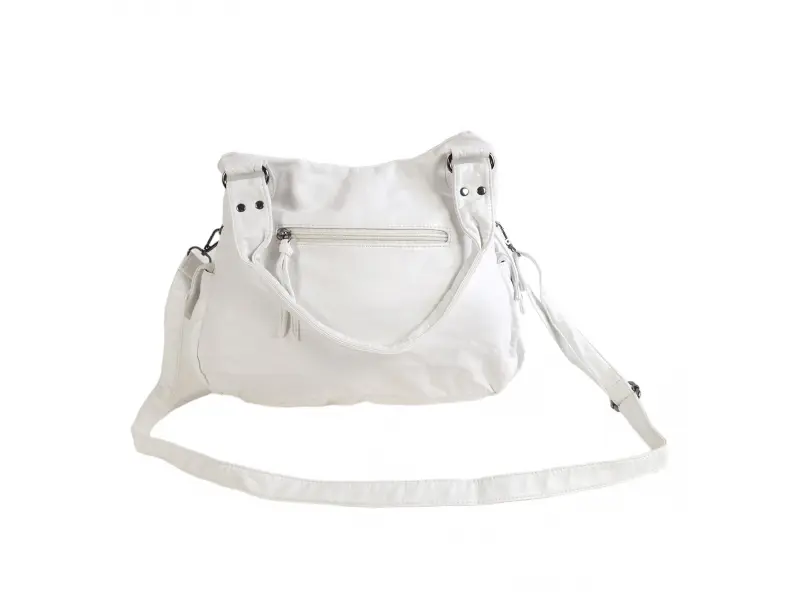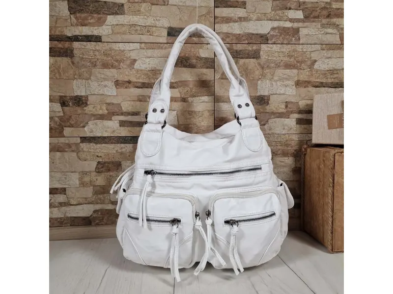 Бяла дамска чанта - Дамска чанта от варена кожа. - Две основни отделения с цип. - Малък вътрешен джоб с цип. - Отделения за телефон и документи. - Пет предни джоба с цип. - Заден джоб с цип. - Два странични джоба. - Удобни дръжки за носене. - Дълга регулираща се дръжка.