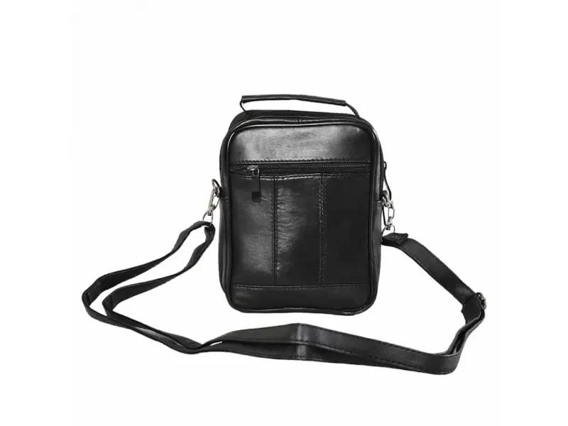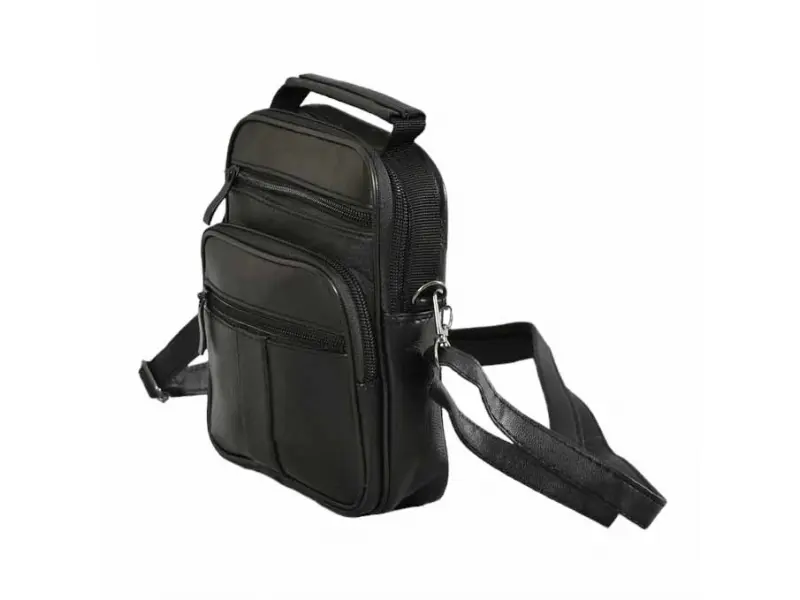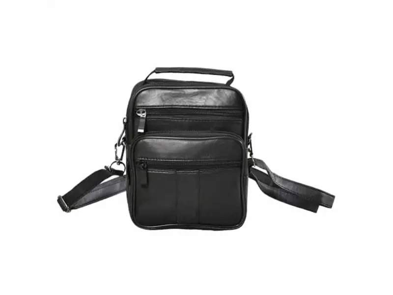 Удобна мъжка чанта от естествена кожа - Едно основно отделение с цип. - Малък вътрешен джоб с цип. - Три предни джоба с цип. - Заден джоб с цип. - Регулираща се презрамка. - Дръжка за носене в ръка.