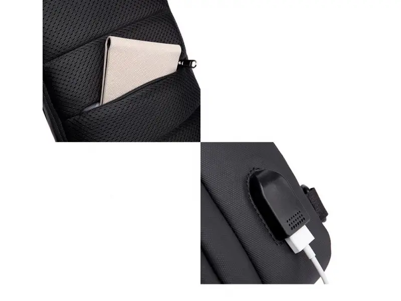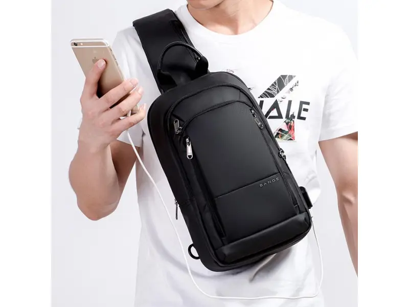 Мъжка чанта за през гърди - Мъжка чанта, която може да се носи през гърди, рамо или гръб тип раница. - Едно основно отделение с цип. - Три вътрешни джоба без цип. - Вътрешен джоб с цип. - Три предни джоб с цип. - Заден джоб с цип. - Дръжка за носене в ръка. - Регулираща се презрамка. - Възможност за смяна на посоката на носене. - USB порт.