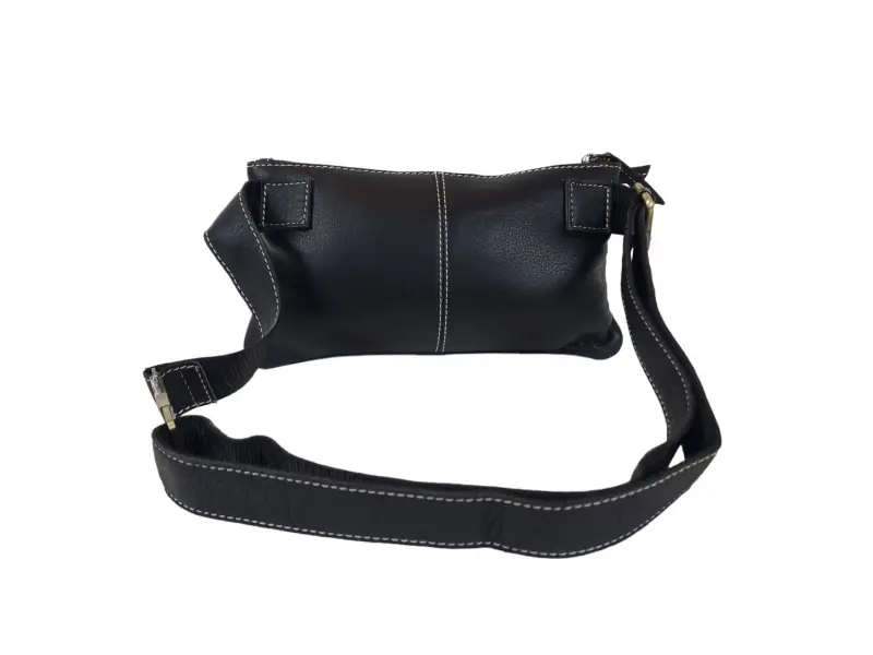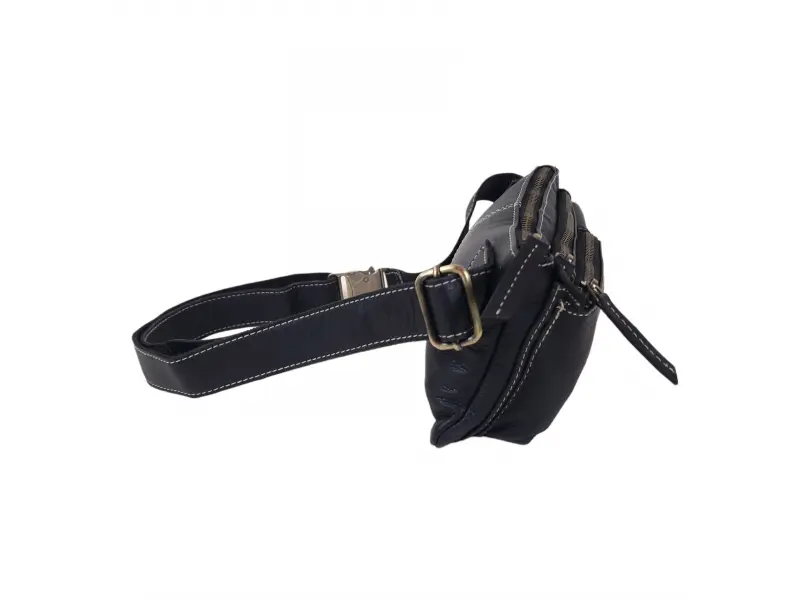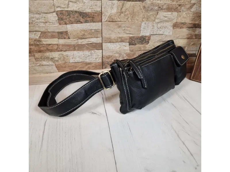 Удобна мъжка чанта от естествена кожа - Едно основно отделение с цип. - Малък вътрешен джоб с цип. - Два предни джоба с цип . - Преден джоб с тик - так копче. - Регулиращ се колан.
