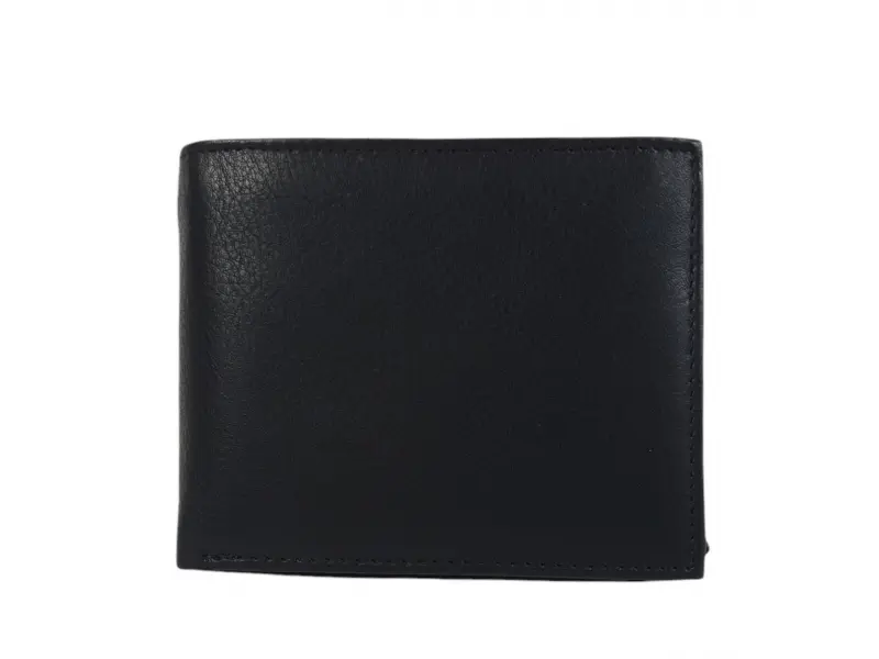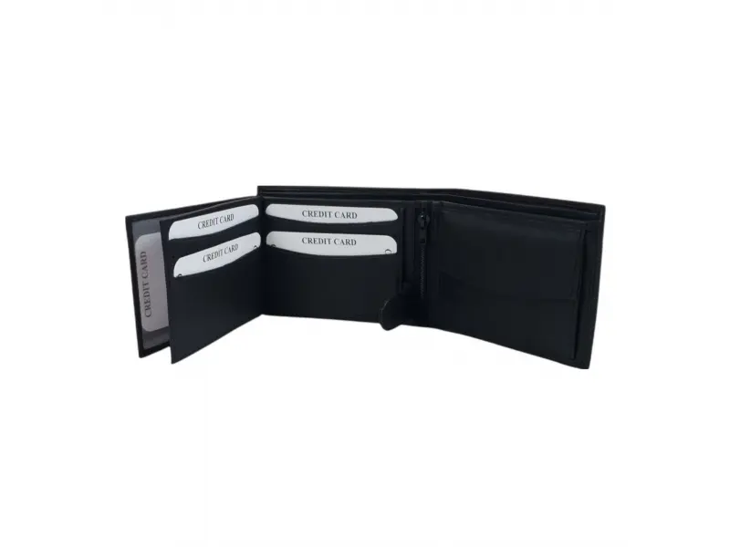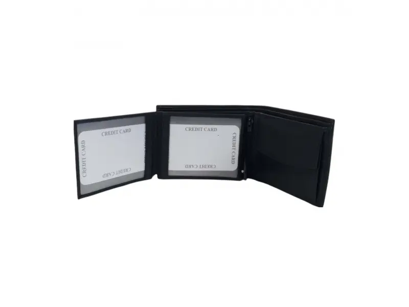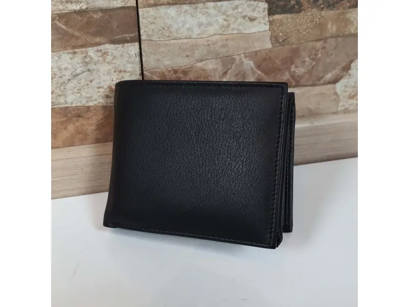 Качествен мъжки портфейл от естествена кожа в черен цвят. Мъжки портфейл с много слотове за карти и документи, отделение за банкноти и вътрешен монетник.