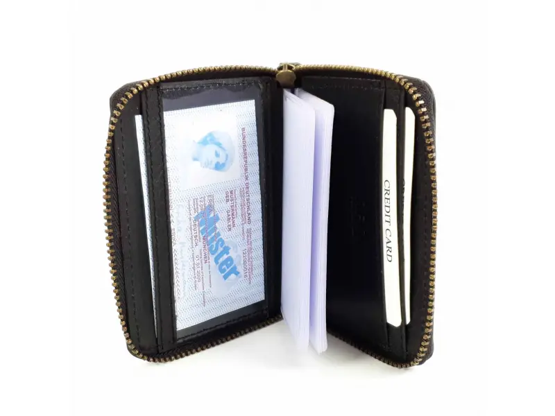 Качествен черен визитник с цип. Удобен модел визитник със слотове за карти и място за визитки. Визитник от естествена кожа с RFID защита.