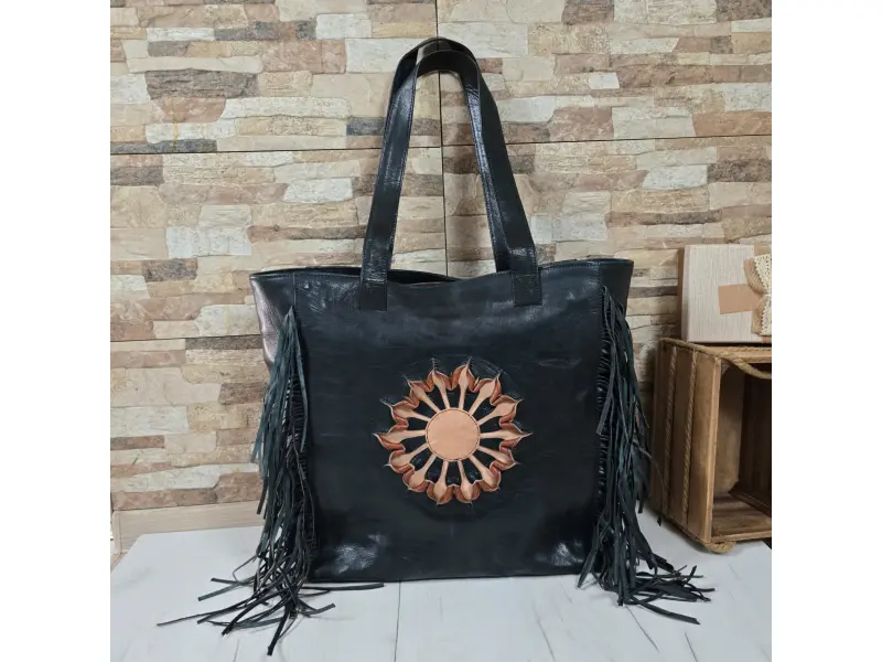 Уникална дамска чанта от естествена кожа, ръчно изработена. Мароканска дамска чанта с уникален дизайн със слънце и ресни. Стилна дамска чанта с удобни дръжки. - ePazar.bg