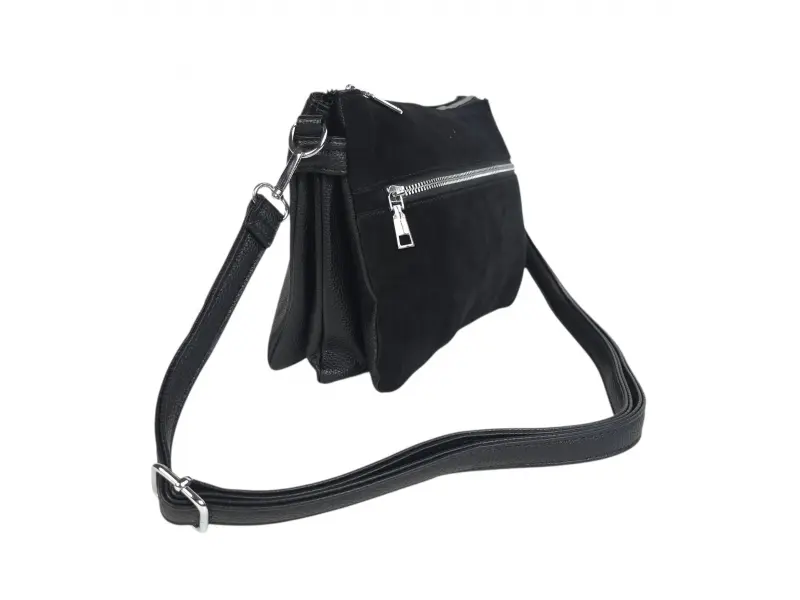 Малка дамска чанта от качествена еко кожа и велур. Удобна дамска чанта с интересен дизайн и удобна дълга регулираща се дръжка в калсически черен цвят.
