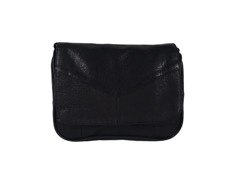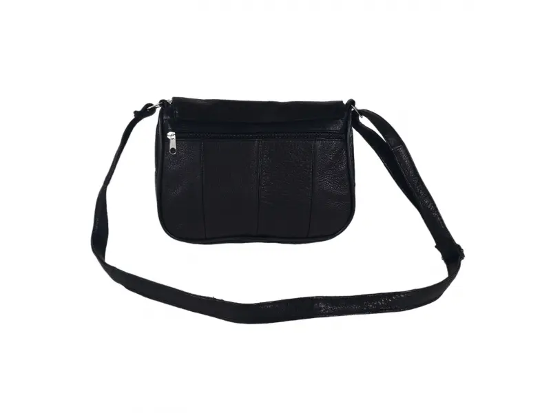 Практична малка дамска чанта - Дамска чанта от естествена кожа. - Едно основно отделение с цип и капак с магнитно закопчаване. - Малко вътрешно джобче с цип. - Преден джоб под капака с цип. - Заден джоб с цип. - Регулираща се се дълга дръжка.