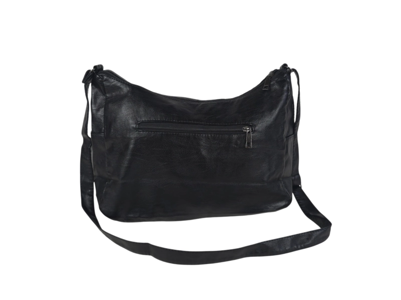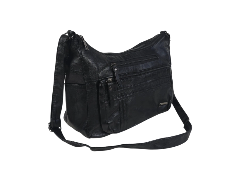 Голяма дамска чанта от мека на допир изкуствена кожа. Ежедневна дамска чанта за през рамо с много отделения. Черна дамска чанта с регулираща се дълга дръжка.