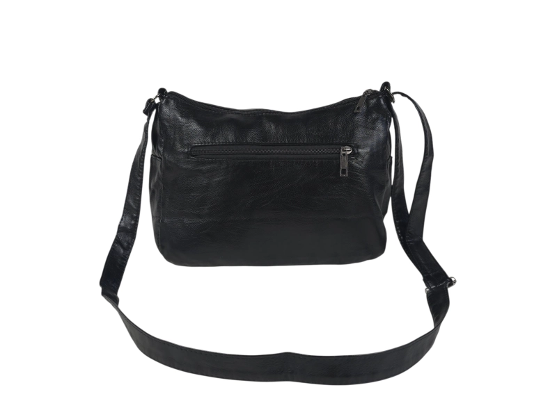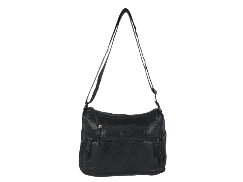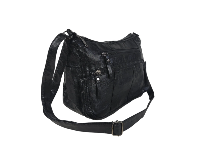 Мека на допир дамска чанта - Дамска чанта от изкуствена кожа. - Две основни отделения с цип. - Малък вътрешен джоб с цип. - Два предни джоба с цип. - Два странични малки джоба. - Заден джоб с цип. - Удобна дълга регулираща се дръжка.