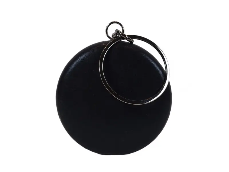 Модерна дамска чанта в кръгла форма - Официална дамска чанта с едно отделение. - Отваряне и затваряне с механизъм. - Метален кант. - Дръжка за носене в ръка. - Дълга дръжка тип верижка.