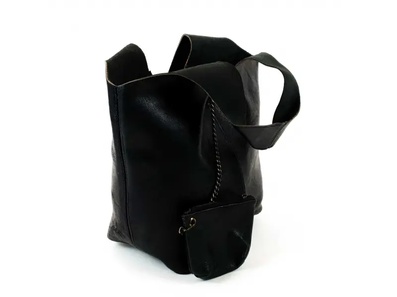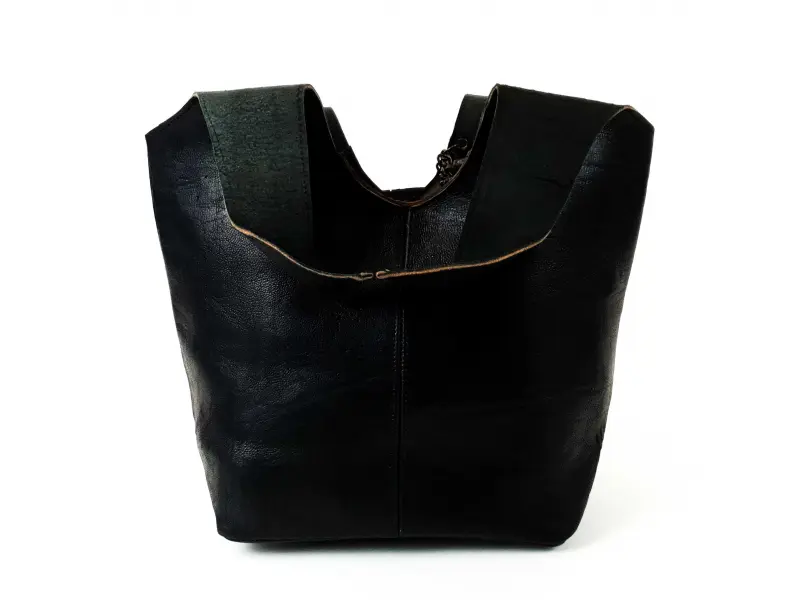 Голяма дамска чанта тип торба от естествена кожа, ръчно обработена. Мароканска черна чанта - торба с магнитно закопчаване, със здрави дръжки и допълнително портмоне с цип.