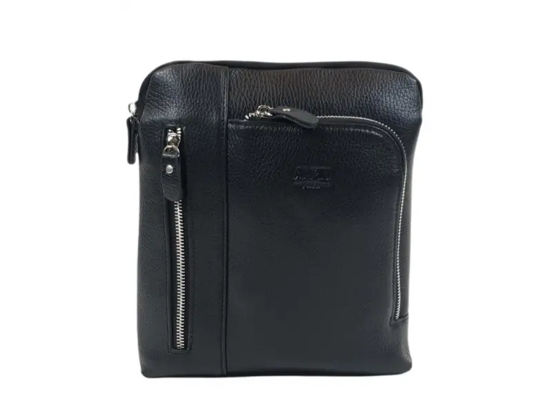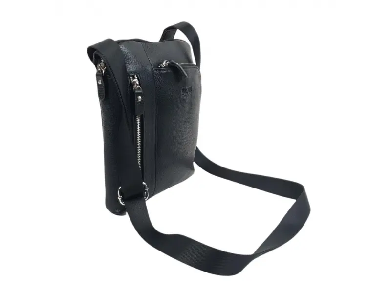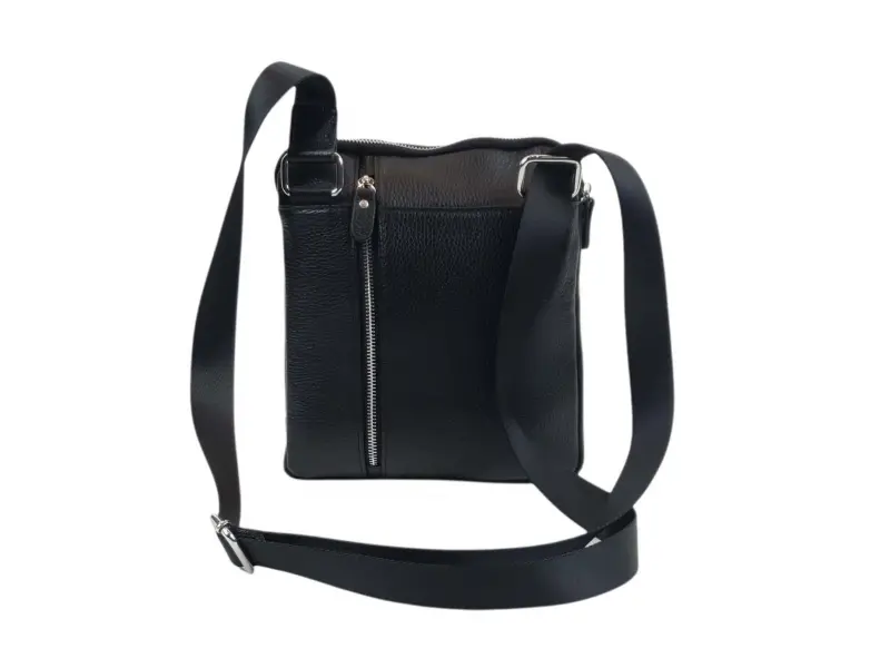 Стилна мъжка чанта от качествена естествена кожа. Черна мъжка чанта с едно основно отделение с цип, малко вътрешно джобче с цип, отделение за телефон или документи, отделение за химикали или моливи, две предни джобчета затварящи се с цип и заден джоб с цип. Удобна чанта с дълга регулираща се дръжка за през рамо.