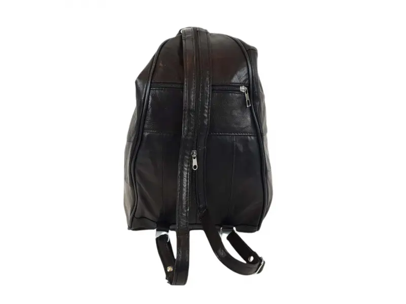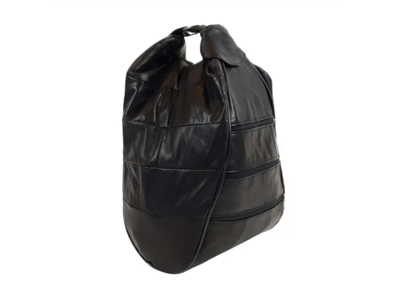 Качествена дамска раница - чанта от агнешка естествена кожа. Черна раница с едно основно отделение с цип, малко вътрешно джобче с цип и три предни джобчета с цип. Голяма раница с удобни регулиращи се презрамки, които могат да се закопчват с цип и възможност за носене като чанта.