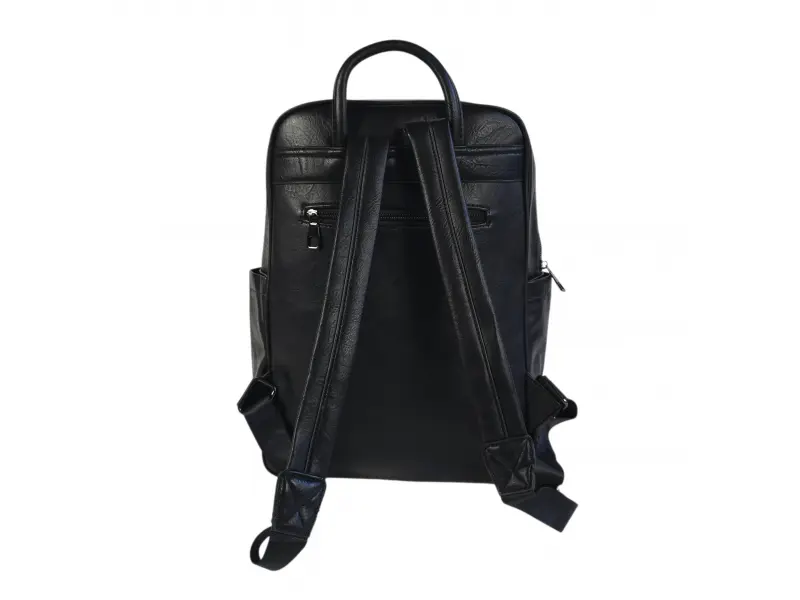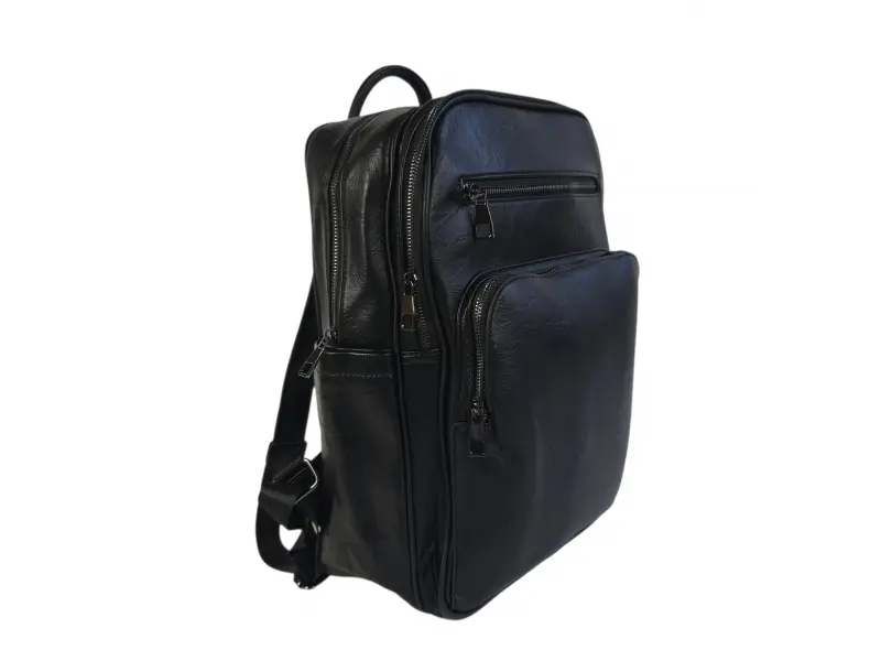 Голяма раница от еко кожа - Унисекс модел - подходящ за мъже и за жени. - Едно основно отделение с цип. - Вътрешен джоб с цип. - Два предни джоба с цип. - Голям преден джоб с цип. - Заден джоб с цип. - Удобна дръжка за носене в ръка. - Регулиращи се презрамки.