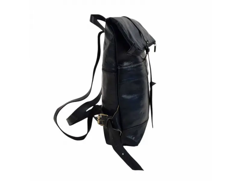 Качествена раница от естествена кожа в черен цвят. Мароканска раница с едно голямо отделение затварящо се с цип и кожен колан и заден джоб с цип. Раница със здрава дръжка за носене и удобни регулиращи се презрамки.