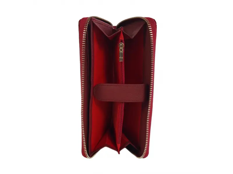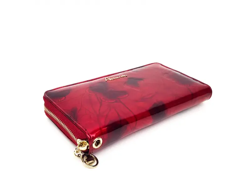 Дамско портмоне от естествена кожа в червен лак. Елегантно портмоне затварящо се с цип , удобно разпределение от естествена кожа за банкнотите , слотове за карти и място за лични документи . Отделение с цип отзад. Разположението на пеперудите може да бъде различно.