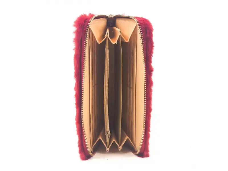 Червено портмоне - пух. Дамско портмоне от ePazar.bg от еко кожа с червен пух. Стилно дамско портмоне със златист цип с вътрешни прегради за банкноти и документи.