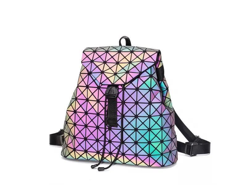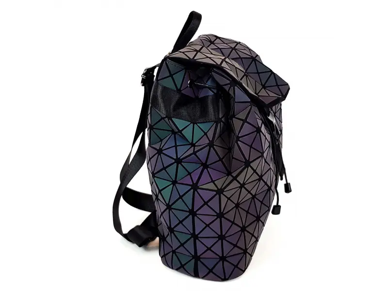 Интересна дамска раница тип мешка с едно голямо отделение , което се пристяга с връзки и затваря с капак. Дамска раница в цвят хамелеон , който си променя цвета в зависимост от светлината. Раница с регулиращи се презрамки и дръжка за закачане.
