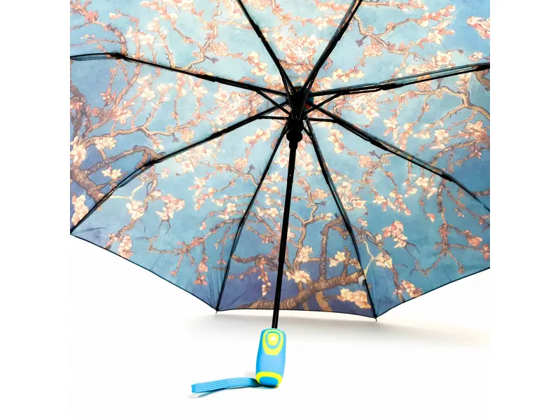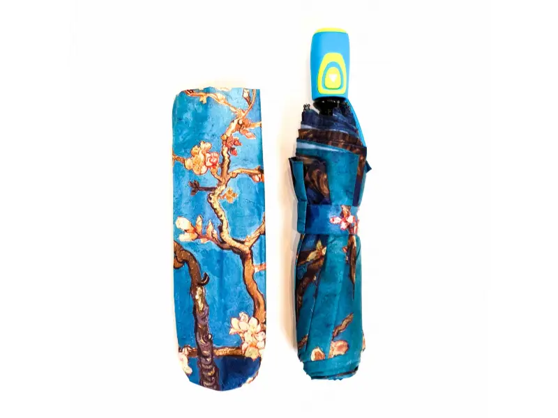 Компактен дамски чадър с изображението на картината на известния Ван Гог - "Бадемов цвят". Качествен чадър с автоматично отваряне, бързосъхнеща материя, удобна дръжка и калъф за прибиране. Височината в сгънато състояние - 30 см.