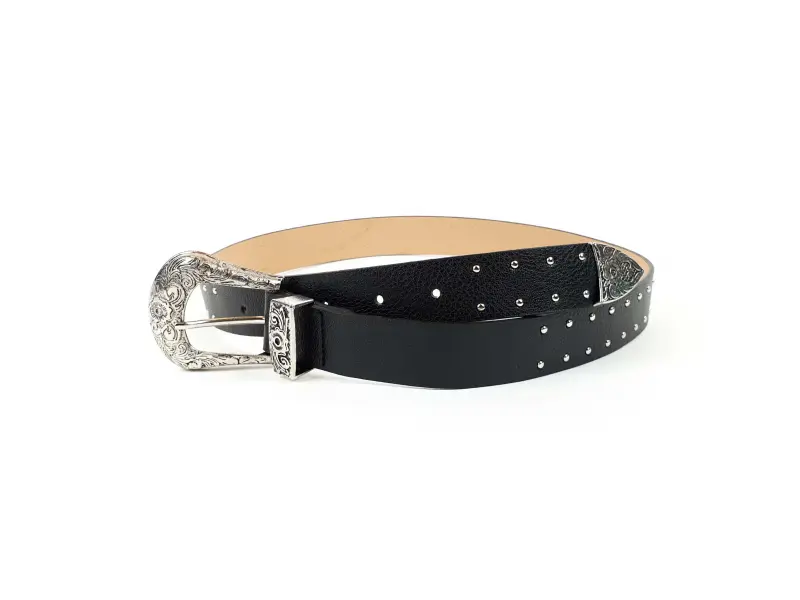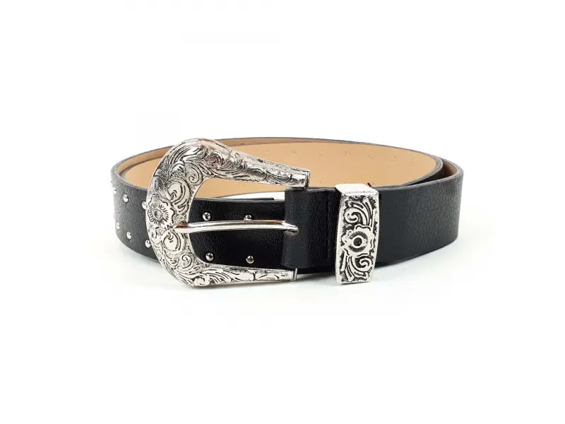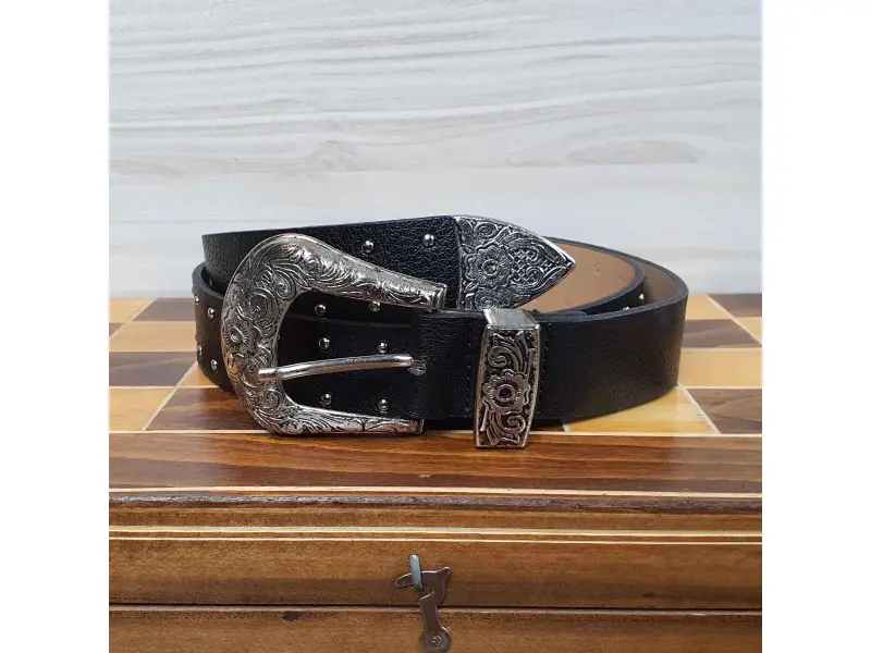 Дамски колан от изкуствена кожа в черен цвят. Дамски колан с капси и интересна тока.