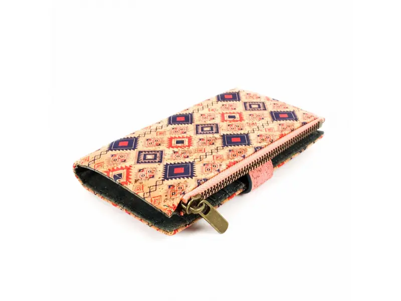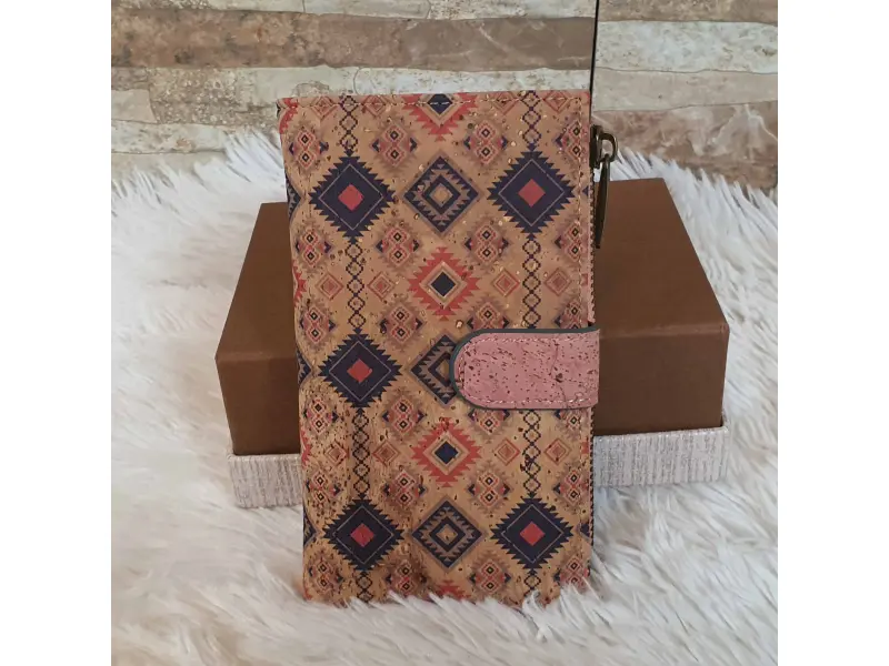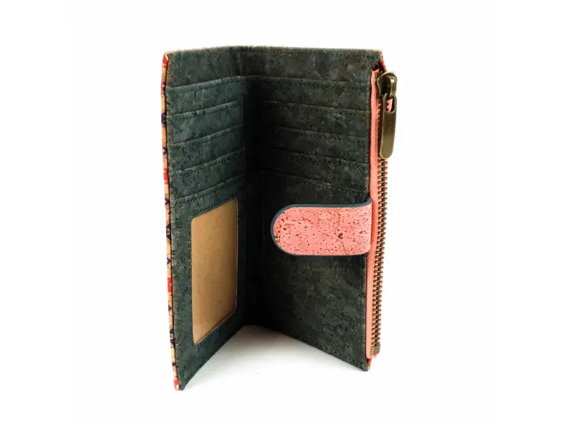 Интересно дамско портмоне от екологична, водоустойчива материя - корк. Качествено дамско портмоне със закопчалка, слотове за карти и документи, отделение за банкноти и външен монетник с цип.
