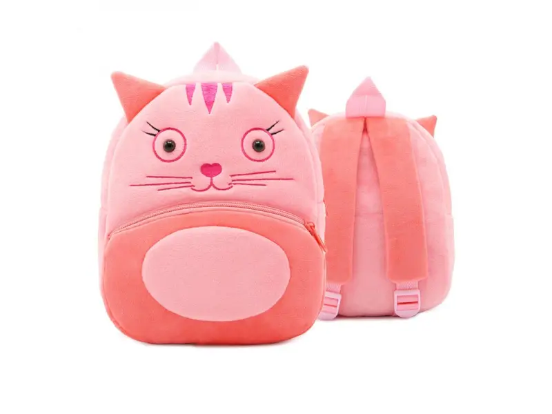Детска раница - коте. Детска раница - коте от плюшена материя с едно остновно отделение и преден джоб с цип. Раница с меки и удобни регулиращи се презпрамки.