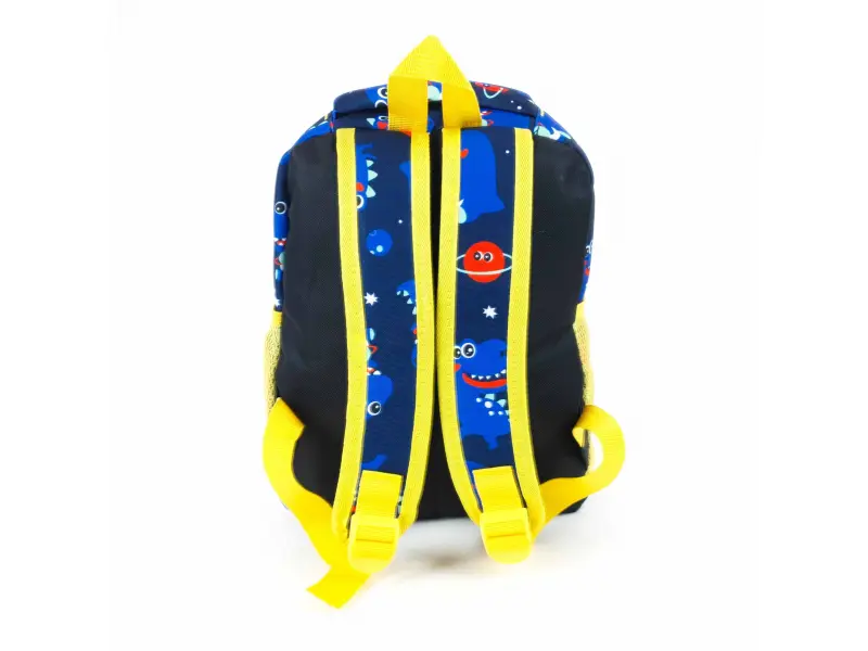 Детска раница подходяща за момче с динозавър. Раница с едно голямо отделение с цип, малка преграда, преден джоб с цип, две места за бутилки, дръжка за носене и регулиращи се презрамки.