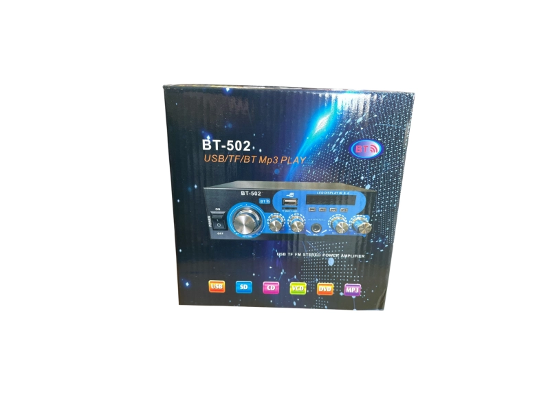 Открийте мощния домашен блутут аудио усилвател BT-502 с USB, FM радио, TFT дисплей и 2x30W стерео звук. Лесно свързване и кристално чисто аудио за всяко помещение. Поръчайте сега и се насладете на любимата си музика! 🎶