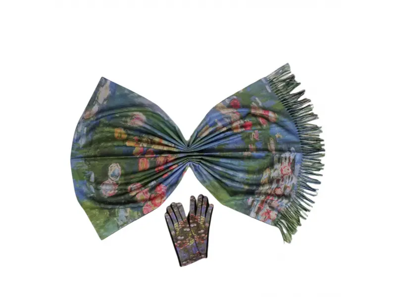 Комплект двулицев дамски шал и ръкавици с изображението на картините на известният Клод Моне - "Водни лилии" и Клод Моне - "Мадам Моне и нейният син". Мек и удобен шал от 100% вискоза. Ръкавиците са един размер имат еластичност от S до XL с показалеца може да се работи на телефон или смарт устройство.