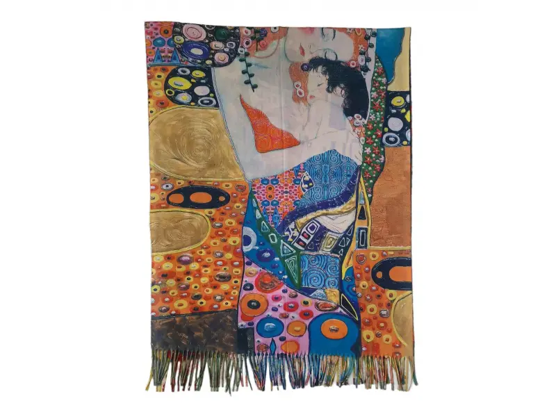 Шарен дамски шал с "Целувката" - Густав Климт - "Целувката". - Густав Климт - "Трите възрасти на жената"" - Двулицев дамски шал с картини. - Шал от вискоза. - Мек и удобен.