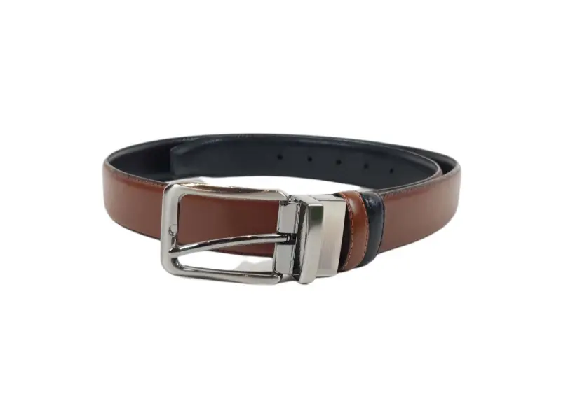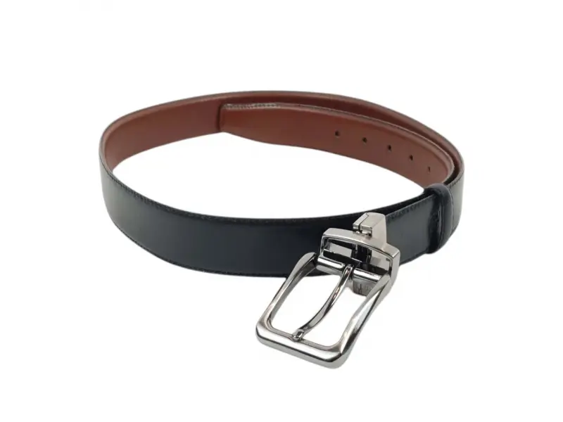 Двулицев мъжки колан от естествена телешка кожа в черен и кафяв цвят. Удобен колан с лесно въртяща се метална тока, подходящ за дънки и панталони с възможност за лесно скъсаване.