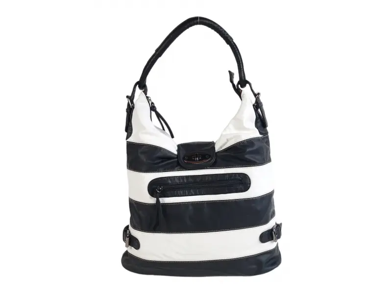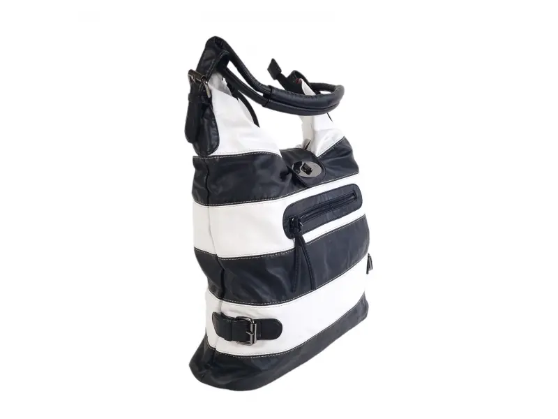 Черно-бяла дамска чанта - Дамска чанта от варена кожа. - Едно основно отделение с цип и с механизъм. - Малък вътрешен джоб с цип. - Отделения за телефон и документи. - Преден джоб с цип. - Заден джоб с цип. - Удобна регулираща се дръжка за носене.
