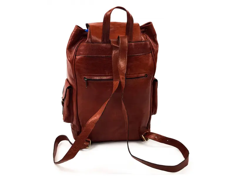 Голяма раница от естествена кожа в червеникаво - кафяв цвят. Качествена естествена кожа , раница с едно голямо отделение затварящо се с кожени връзки и капак с колан , предно джобче и странични малки джобчета , регулиращи се кожени презрамки , заден джоб с цип и кожена дръжка за закачане или носене.