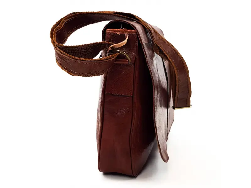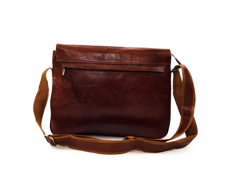 Мъжка чанта с капак от натурална естествена кожа произведена в мароко. Мъжка кожена чанта тип месинджър с регулираща се дълга дръжка от кожа и плат. Едно голямо отделение затварящо се с цип , вътрешна кожена подплата , място за химикалки и моливи , слотове за карти и документи. Мъжка стабилна чанта за през рамо в кафяв нюанс с заден джоб затварящ се с цип.