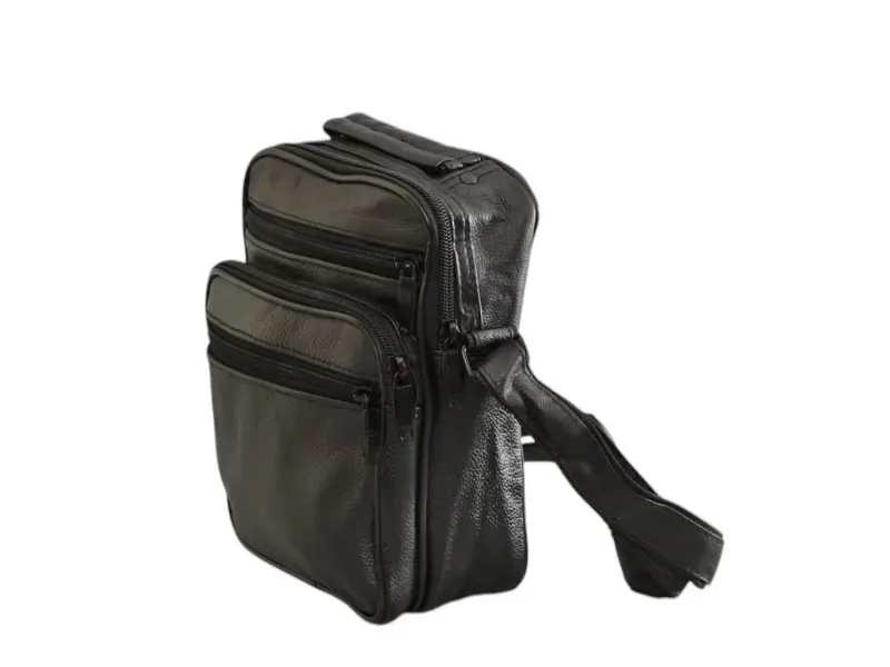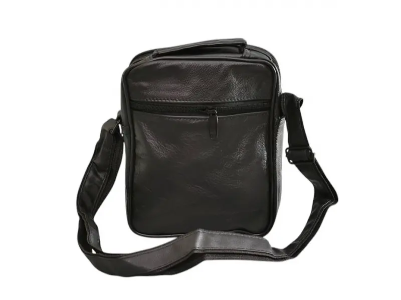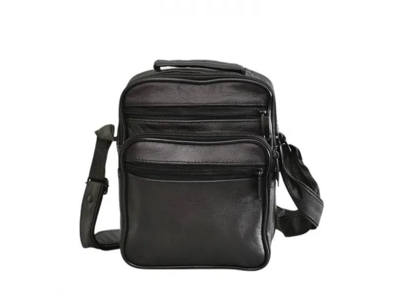 Мъжка чанта от естествена кожа - Едно основно отделение с цип. - Три предни джоба с цип. - Заден джоб с цип. - Регулираща се презрамка.