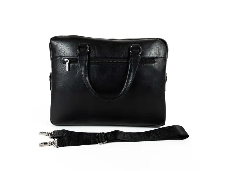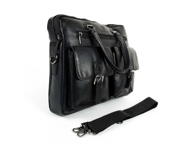 Голяма мъжка чанта от качествена еко кожа в черен цвят. Мъжка чанта с едно основно отделение с цип, малко вътрешно джобче с цип, място за телефон и документи, отделение за лаптоп, заден джоб с цип, две предни джобчета с магнитно закопчаване и едно с цип. Чанта с удобна дълга регулираща се дръжка от плат.