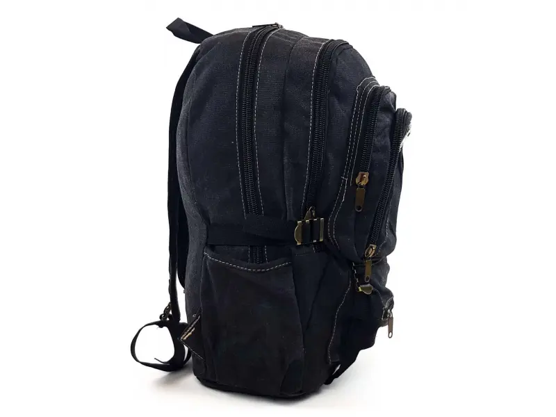 Изключително здрава раница от брезент в черен цвят , много отделение , лесно отварящи и затварящи се метални ципове , места за бутилки , регулиращи се презрамки и притискащи обема на раницата. Много голяма и здрава раница подходяща за излети , лов и риболов , даже и за училище. Здрава вътрешна подплата не пропускаща вода.