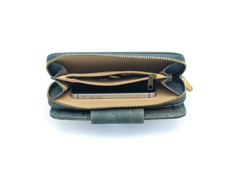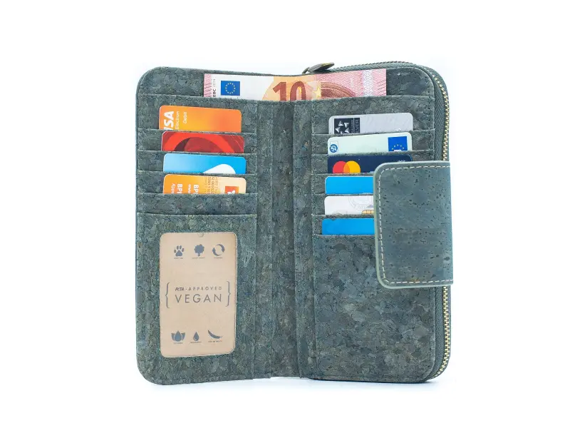 Качествено дамско портмоне от екологична материя - корк. Удобно дамско портмоне със закопчалка и външен монетник затварящ се с цип, преграда за монети и малък монетник с цип, много слотове за карти и документи и отделение за банкноти.