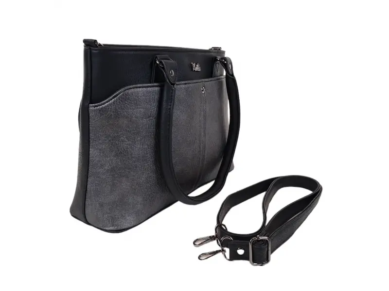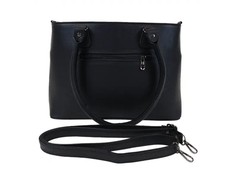 Дамска чанта произведена в България - Дамска чанта от еко кожа. - Три отделения затварящи се с цип. - Преден джоб с магнитно закопчаване. - Място за телефон и ключове. - Вътрешно джобче с цип. - Задно джобче с цип. - Дълги презрамки. - Допълнителна дълга дръжка.