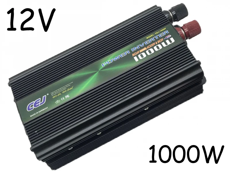 Инвертор на напрежение от 12V на 220V с мощност 1000WПреобразувателя на напрежение е подходящ за лек автомобил, каравана, кемпер и е много надеждно устройство, има защита от претоварване, късо съединение и прегряване.Електрониката е разположена в масивен алуминиев корпус и се охлажда допълнително от вентилатор.С този инвертор получавате бюджетно и надеждно решение за захранване практически навсякъде на различен тип устройства и потребителска електроника: преносими компютри, зарядни устройства, телевизори, видео и DVD плеъри, игрови конзоли, малки инструменти и др., работещи на 220 VAC. Той разполага с висока пикова мощност. Компактният дизайн, металния корпус и сравнително ниското тегло позволяват употребата му в различни среди. Вградените защити предпазват вашите устройства от повреди, а защитата за изтощена батерия предпазва от дълбоко разреждане на батерията, използвана за захранване. Така Вие ще сте сигурни, че разполагате с достатъчно заряд, за да стартирате Вашето превозно средство.Технически характеристики:Модел: CEJ 1000P 12VВходящо напрежение: 10 - 15 VDCСтойност на тока в режим"stand by": 0.3 AИзходно напрежение: 220 VACИзход: контакт 220V.Изход: USB порт 5 V.Изходна форма на вълната: Модифицирана синусоидаЧестота на изхода: 50/60 HzИзходна мощност: 1000 WЕфективност (КПД): 95 %Индикация за разредена батерия: 10.0-15.0 VИзключване при разредена батерия: 9.7- 10.3VТермична защита: 60 +/- 5 ℃Защита при пренапрежение: ДА, микрорегулаторБърза защита при пренапрежение: ДА, микрорегулаторВисоковолтова входна защита: ДА, микрорегулаторЗащита на поляритета на батерията: ДА, чрез предпазителВнимавайте!Мощността на уреда, който захранвате да не превишава мощността на използвания инвертор на напрежение! Номиналната мощност на инвертора да е с до 30% по-висока от мощността на консуматора. Инверторът не трябва да бъде включен при запалване (стартиране) на превозната средство. При неспазване на тези условия инвертора може да бъде претоварен или повреден и гаранцията няма да покрива повредата!