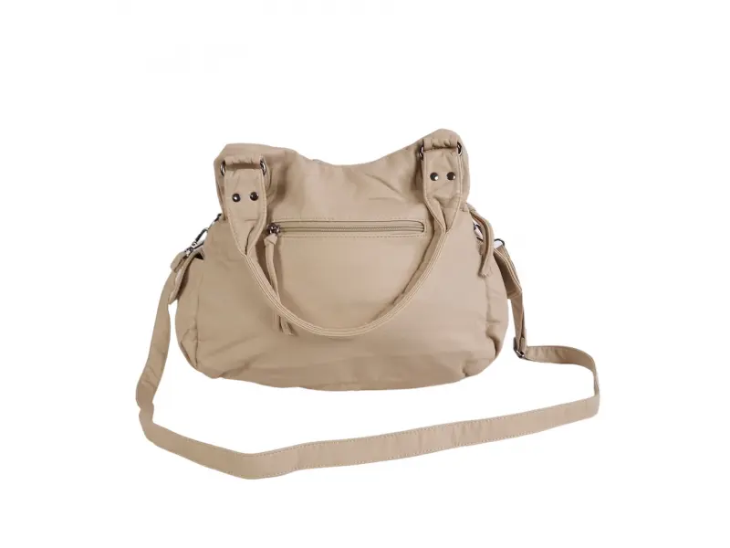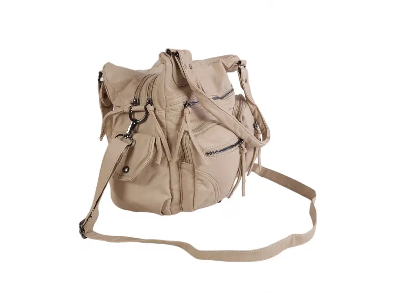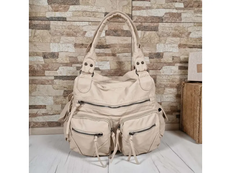 Качествена дамска чанта - Дамска чанта от варена кожа. - Две основни отделения с цип. - Малък вътрешен джоб с цип. - Отделения за телефон и документи. - Пет предни джоба с цип. - Заден джоб с цип. - Два странични джоба. - Удобни дръжки за носене. - Дълга регулираща се дръжка.