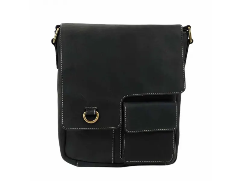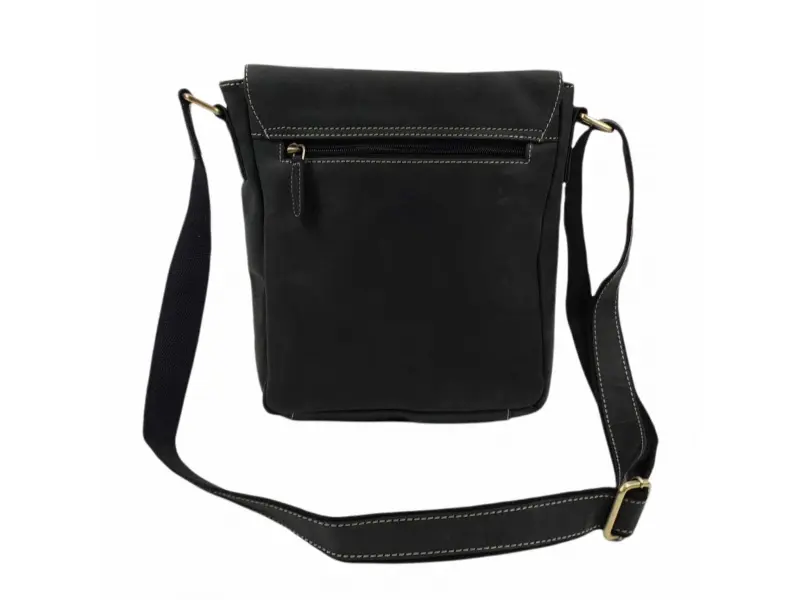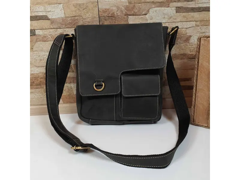 Качествена мъжка чанта от естествена телешка кожа със специална обработка - Hunter. Черна мъжка чанта с капак с магнитно закопчаване. Едно основно отделение с цип, вътрешно джобче с цип, място за телефон и ключове, преден джоб с цип, две предни отделения - едното с магнитно закопчаване и заден джоб с цип, регулираща се кожена дръжка. Може да има малко разминаване в цветовете заради hunter ефекта.