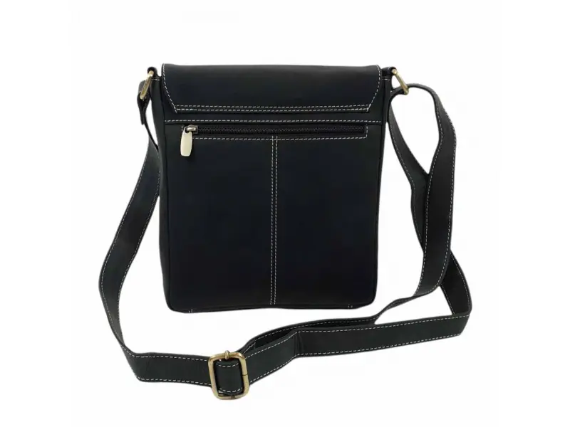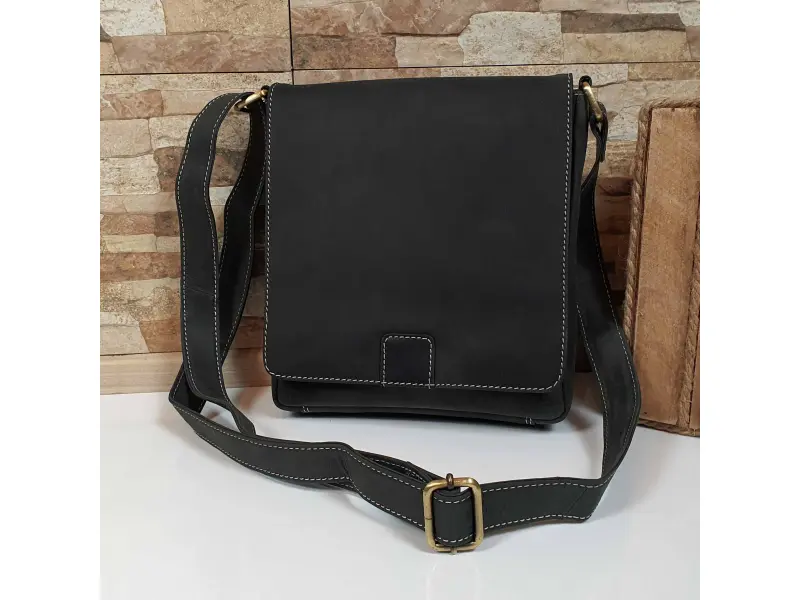 Качествена мъжка чанта от естествена телешка кожа със специална обработка - Hunter. Черна мъжка чанта с капак и магнитно закопчаване, едно основно отделение с цип, вътрешно малко джобче с цип, място за телефон, предно отделения и заден джоб с цип, регулираща се кожена дръжка.